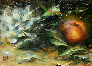 I love how the objects melt into the back ground in low-key paintings. Low-key paintings are those using the bottom half (more or less) of the value range. The light bathes the objects producing a soft glow. It can produce a peaceful scene with a feeling of mystery about it. Other appropriate terms might be "moody" or "atmospheric". I have attempted to create some of these effects in this 6" x 6" study.